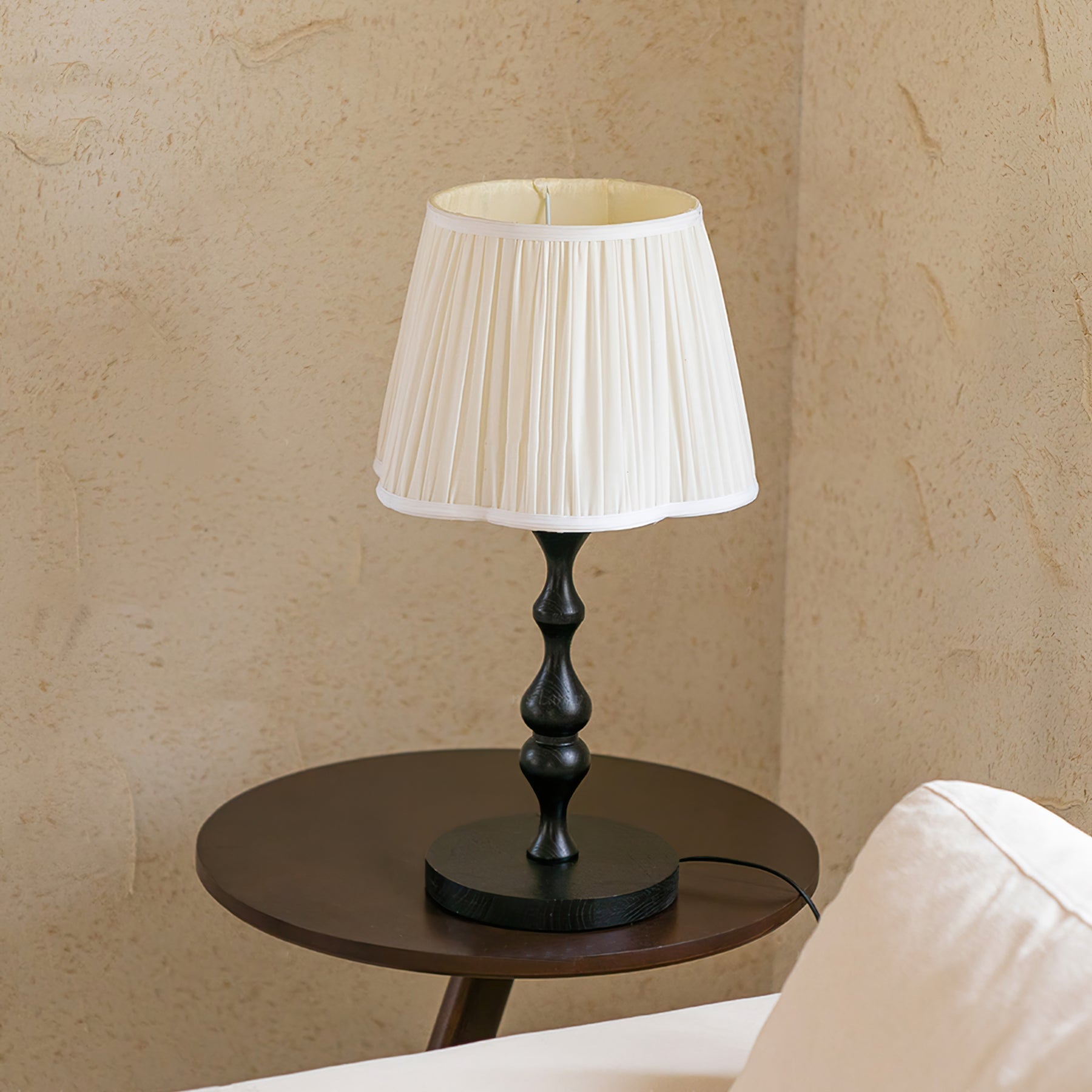 The Ambrosia Table Lamp from dekorfine is a harmonious blend of fabric and wood, designed to bring a touch of sophistication to your space. This table lamp features a gracefully turned wooden base, finished in a sleek, dark tone that complements the elegant fabric shade. The pleated fabric shade diffuses light softly, creating a cozy and inviting atmosphere.