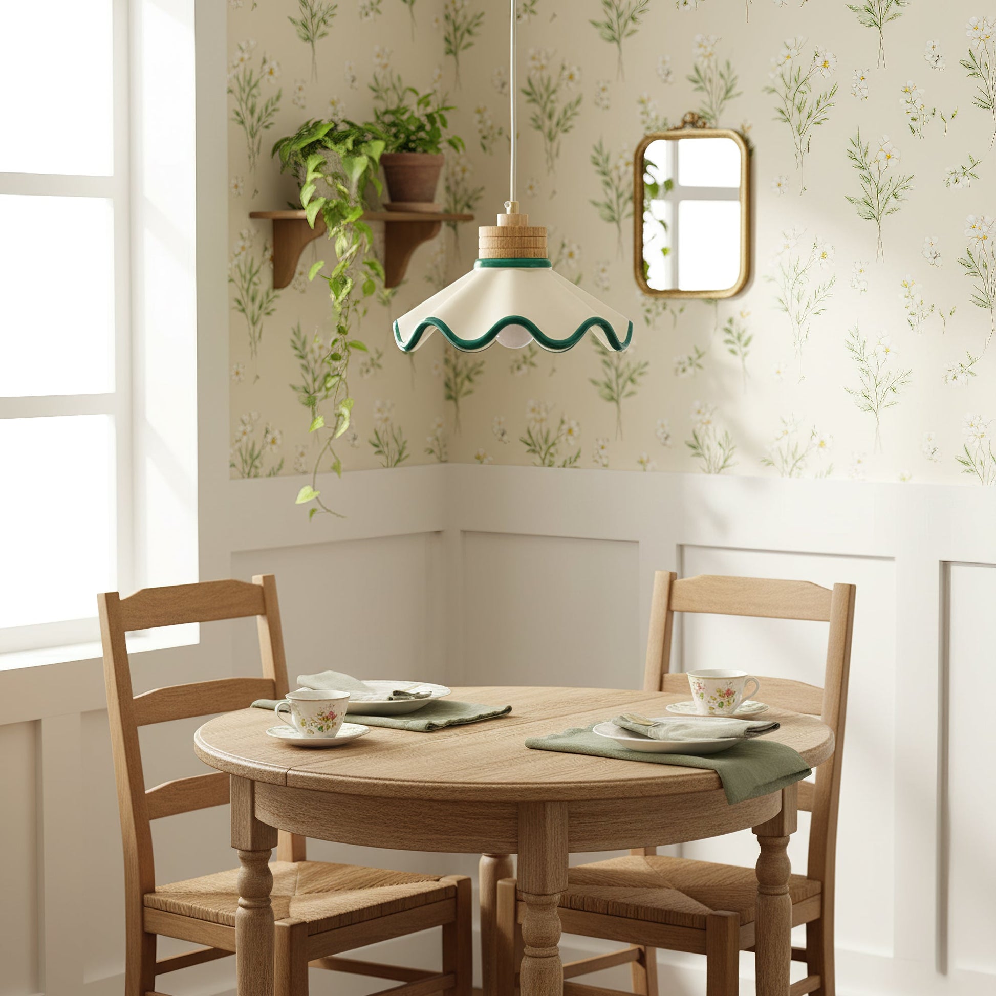 Charming with a touch of whimsy, the Arenal Pendant Light by dekorfine blends playful curves with earthy materials. Its scalloped metal shade, outlined in bold contrast, gives off a retro-modern vibe, while the resin finish and wood accent add warmth and softness.